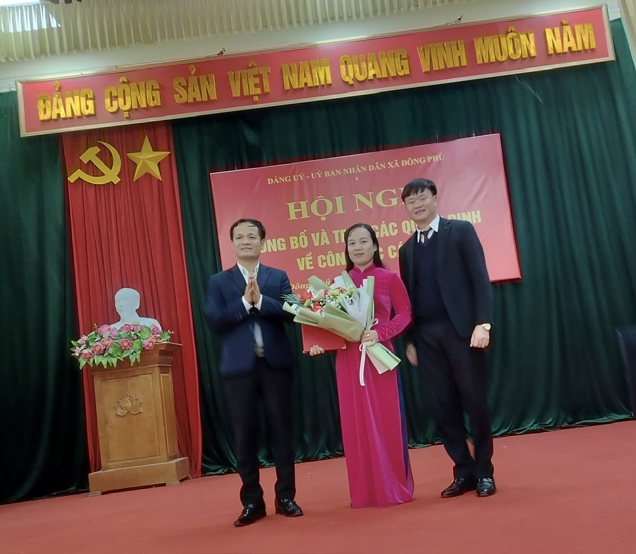 Đối với lĩnh vực y tế, Ban Thường vụ Đảng ủy xã đã công bố Nghị quyết về việc bổ nhiệm đồng chí Lương Thị Hồng Minh, cán bộ phụ trách Trạm Y tế xã Đông Phú, giữ chức vụ Phó Giám đốc Trạm Y tế xã Đông Phú kể từ ngày 01/02/2026; đồng thời giao nhiệm vụ tham gia điều hành hoạt động của Trạm Y tế xã theo quy định.